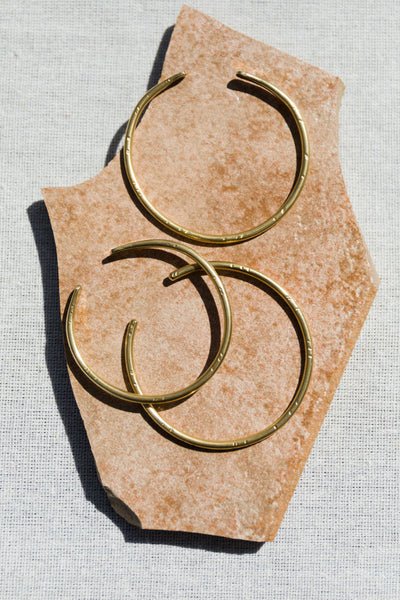 Semi-adjustable, hand-forged round solid brass with unique hammered designs. Also available in sterling silver and 14k gold filled.